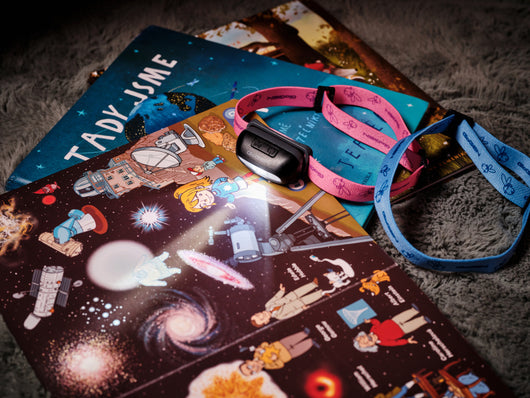 Balení obsahuje hned dva barevné pásky – modrý a růžový – takže si děti mohou vybrat podle nálady nebo vkusu. Díky jednoduchému systému výměny je možné vzhled čelovky snadno měnit.