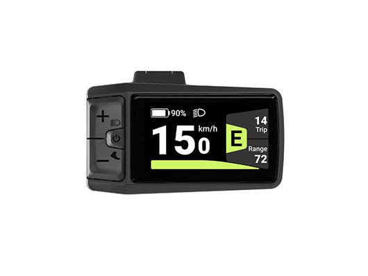 - Displej Bafang DP C080 nahradil displej před pár lety starší černobílý typ. Dnes je tento displej jeden z nejpoužívanějších na kolech s motory M410 a M510. Ovladač je umístěný na levé ruce a umožňuje měnit sílu motoru a přepínat funkce tachometru nebo zapínat osvětlení (jeli součástí soustavy).