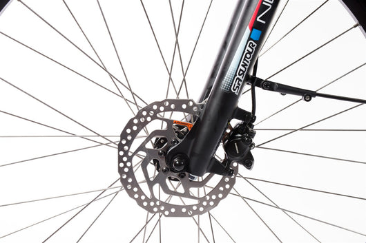- Na tomto kole je použita oblíbená pružinová vidlice SR Suntour NEX E25, která je navíc vybavena uzamykáním, je tedy možné pružení vypnout.