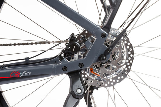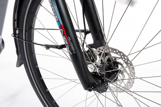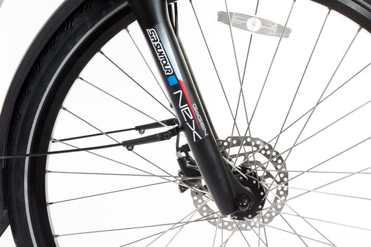 - Na tomto kole je použita oblíbená pružinová vidlice SR Suntour NEX E25, která je navíc vybavena uzamykáním, je tedy možné pružení vypnout.